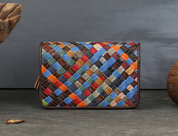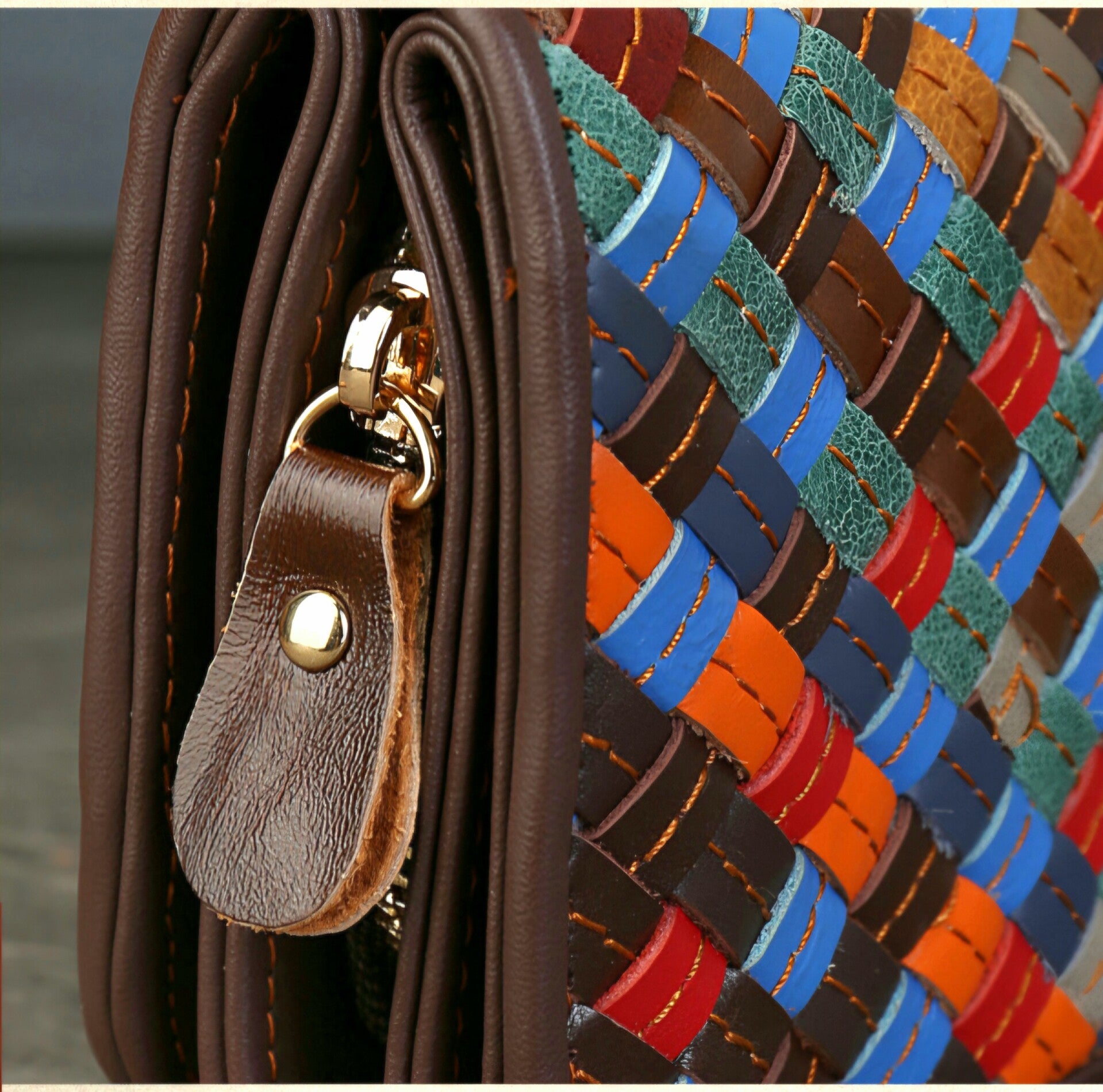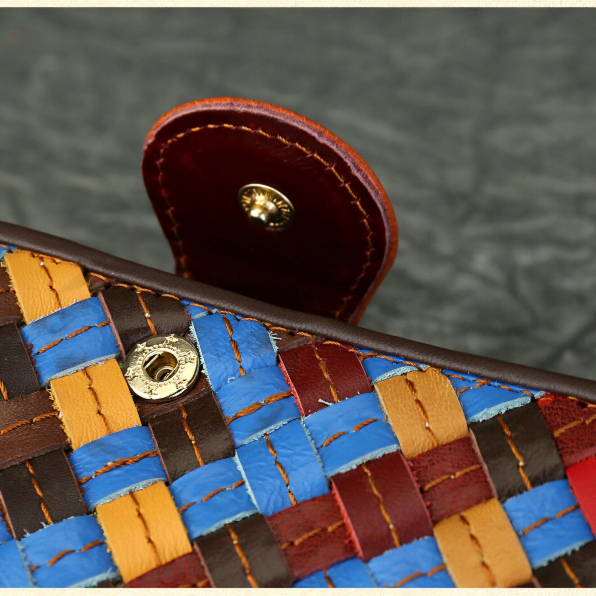 Genuine leather woven color-block short wallet, large capacity, multiple card slots, folding clasp.