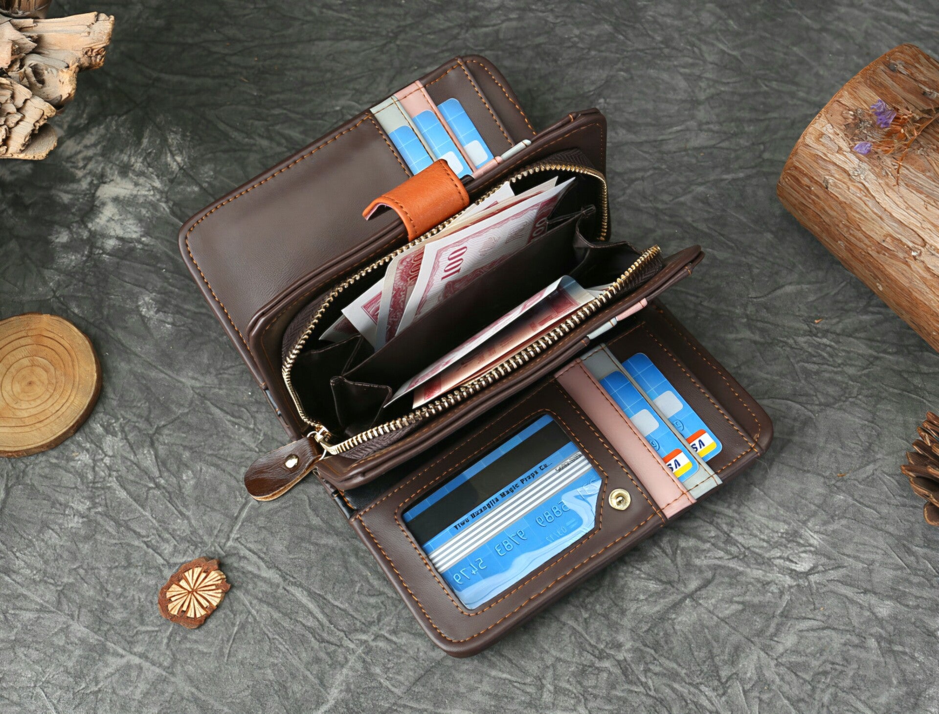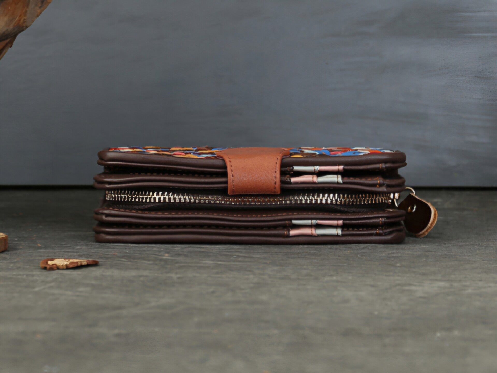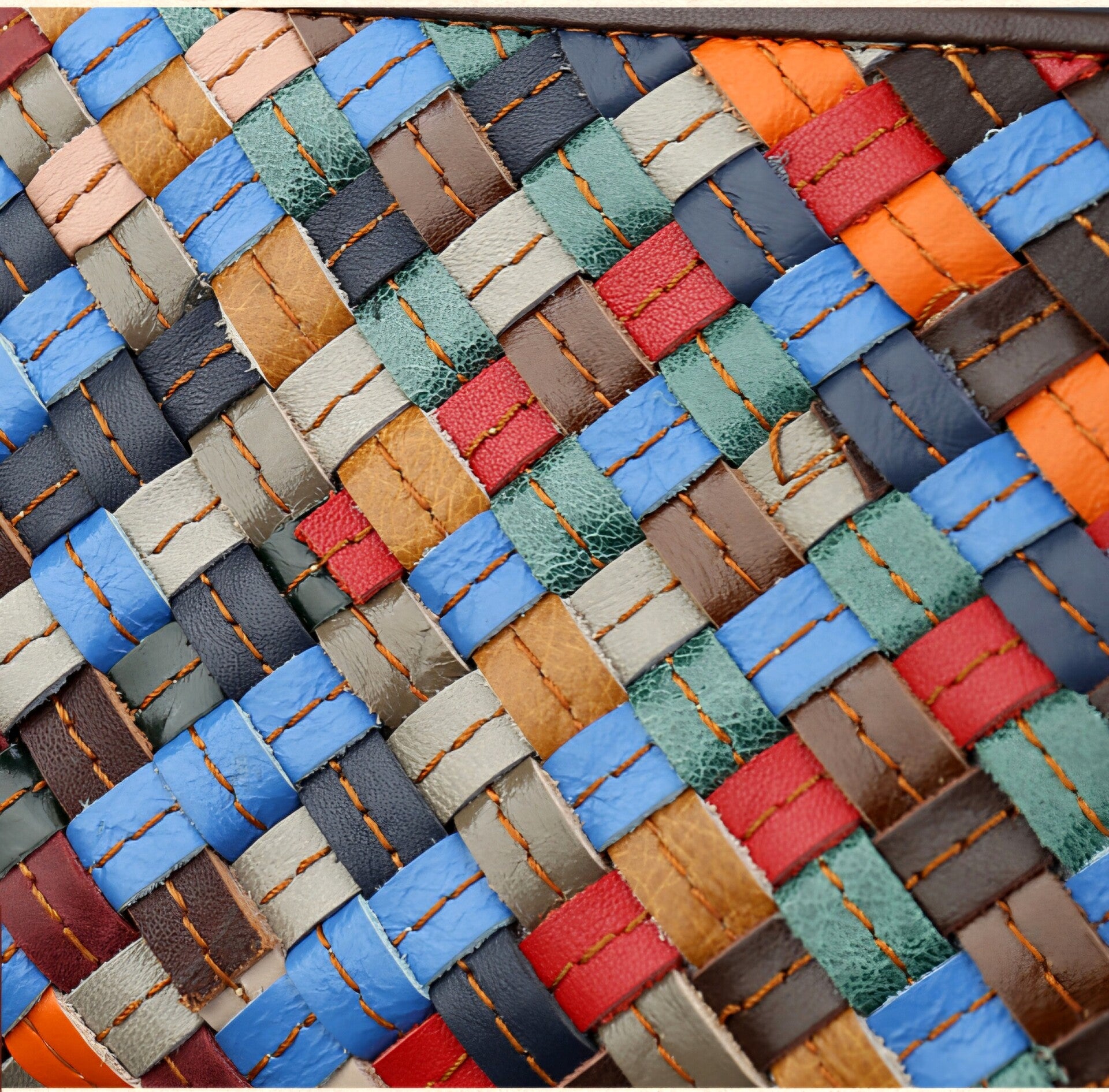 Genuine leather woven color-block short wallet, large capacity, multiple card slots, folding clasp.