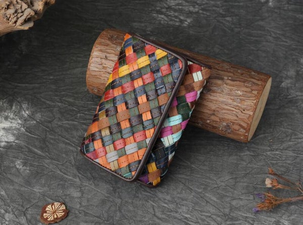 Handmade genuine leather rainbow woven color-block short wallet, large capacity, multiple card slots, folding clasp wallet
