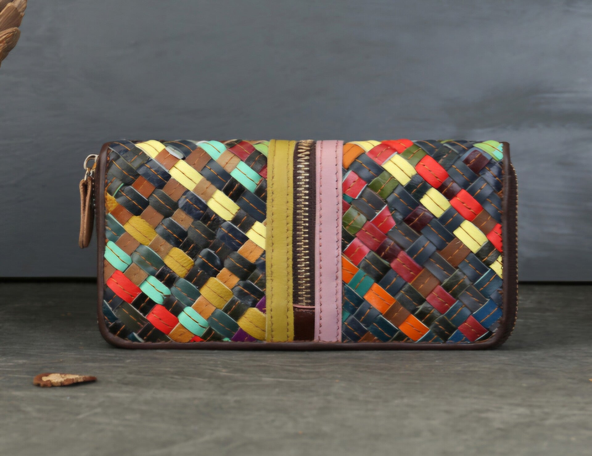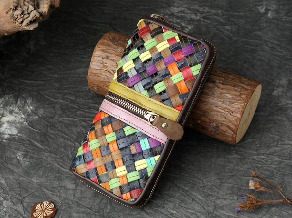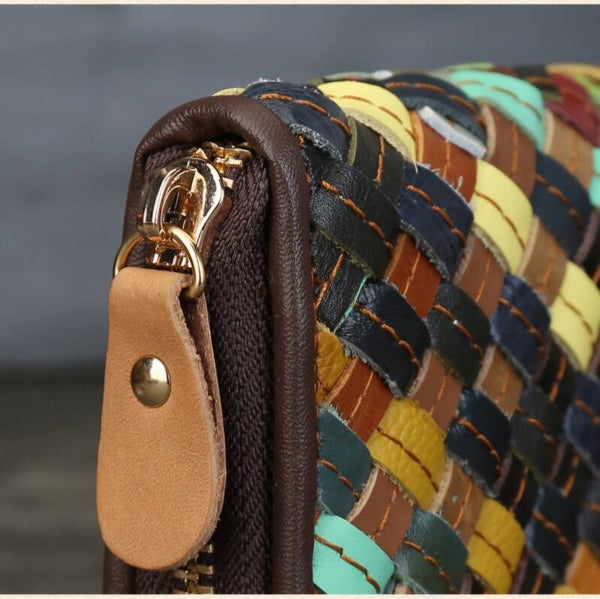Genuine Leather Woven Color-Blocked Long Wallet, Large Capacity, Multiple Card Slots, Zipper Wallet